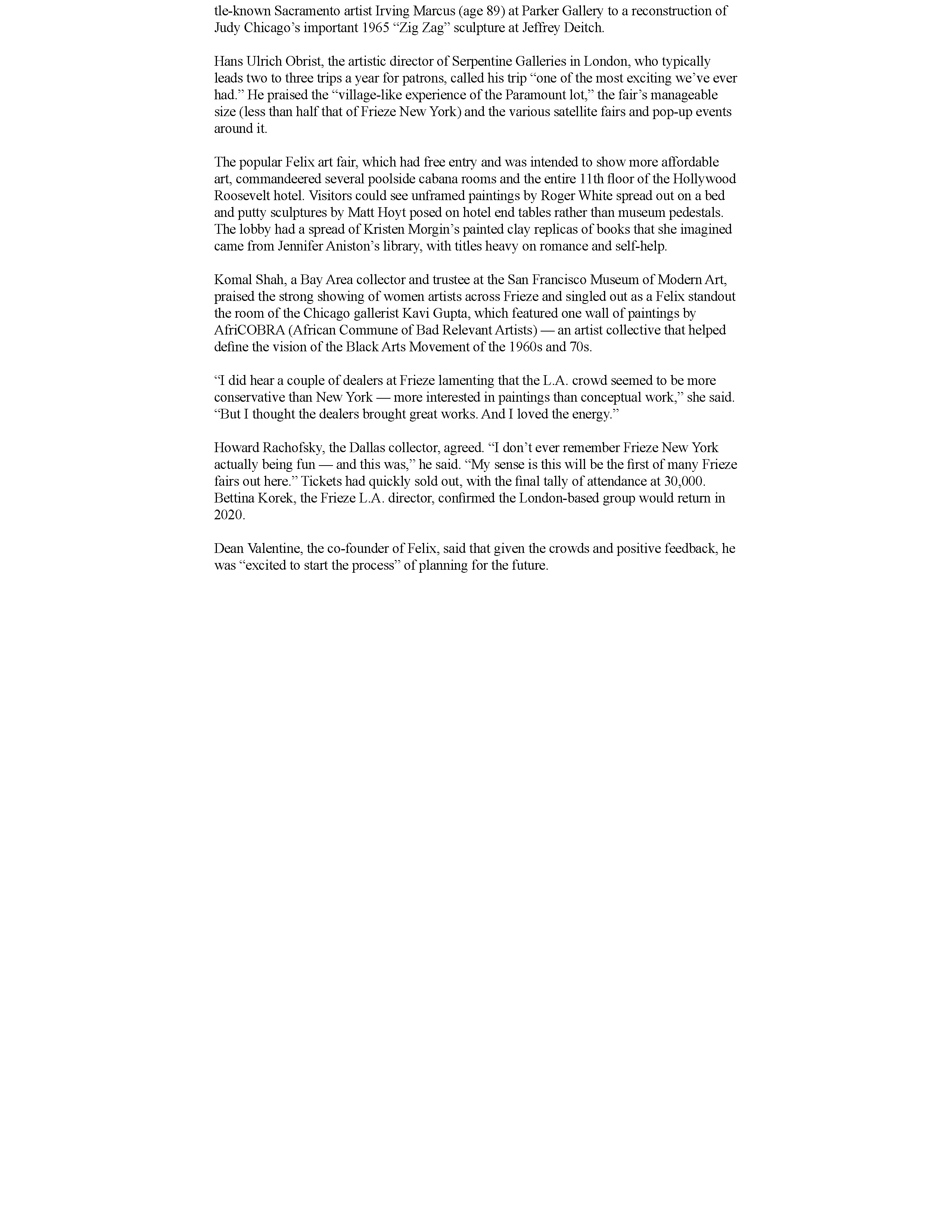 Frieze and Felix Turn Heads in Los Angeles Memorable moments from a weekend of new fairs where art trumps celebrity-watching. By Text by Jori Finkel, Photographs by Graham Walzer February 19, 2019